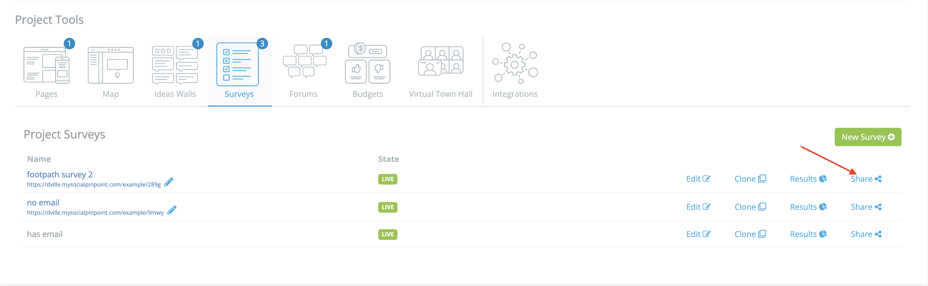 This is also applicable to the individual tools such as Maps, Ideas Walls, Surveys, Forums and Budgets.