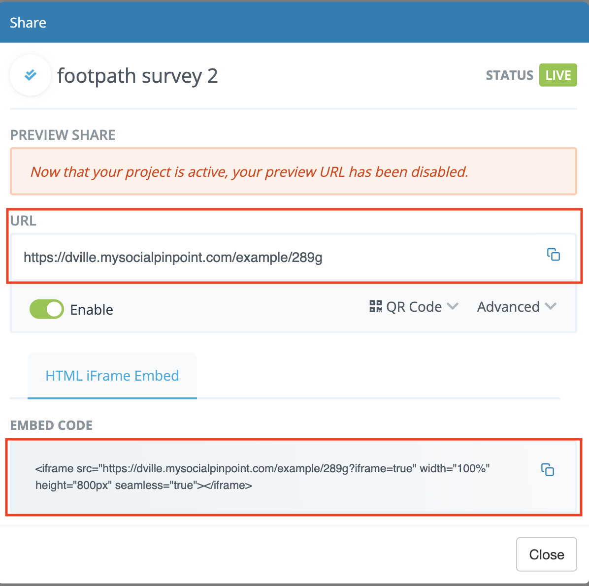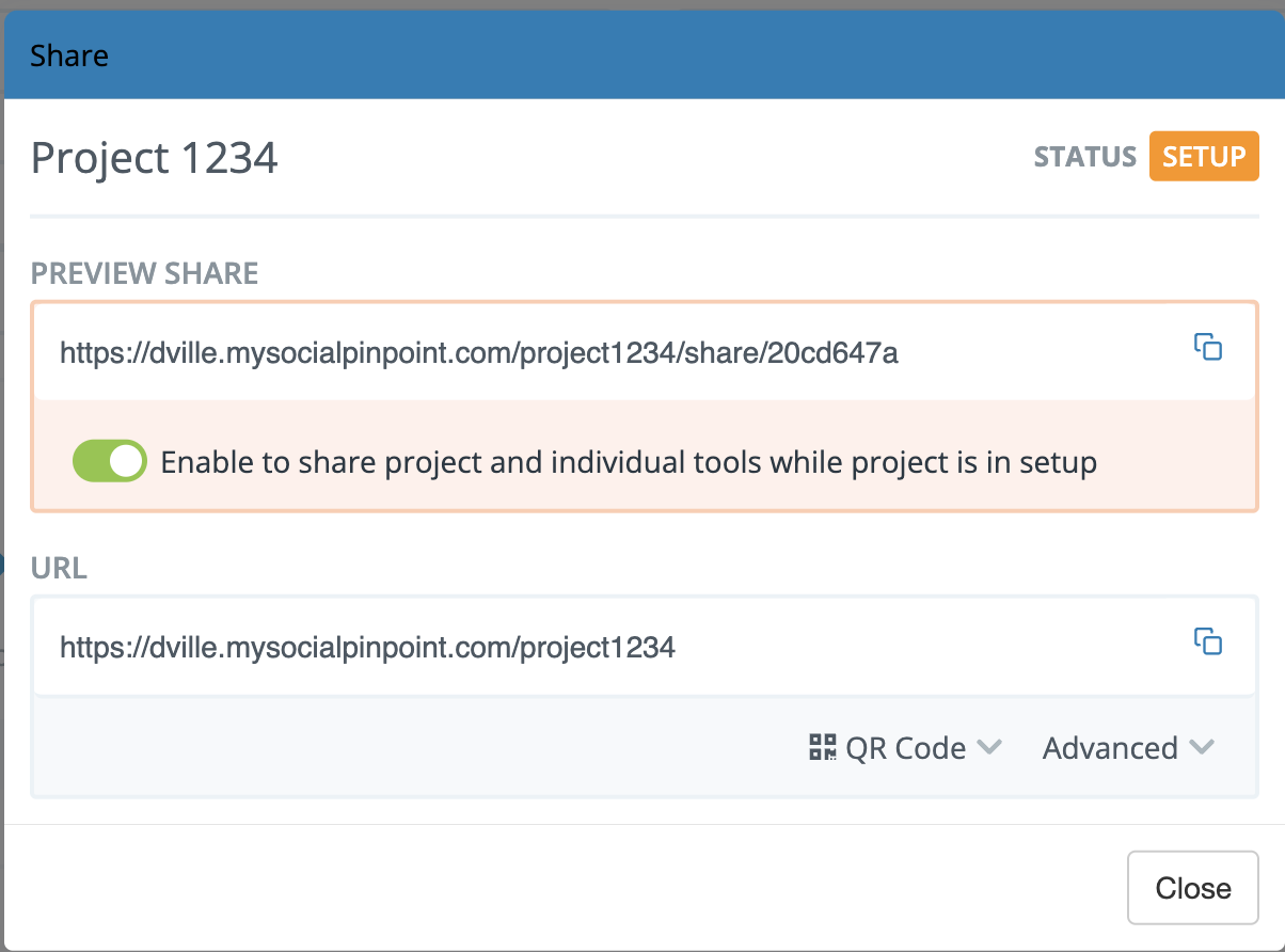From this pop-up you have access to the Project URL which you can copy to link anywhere on your website, as well as accessing a QR code for the project.